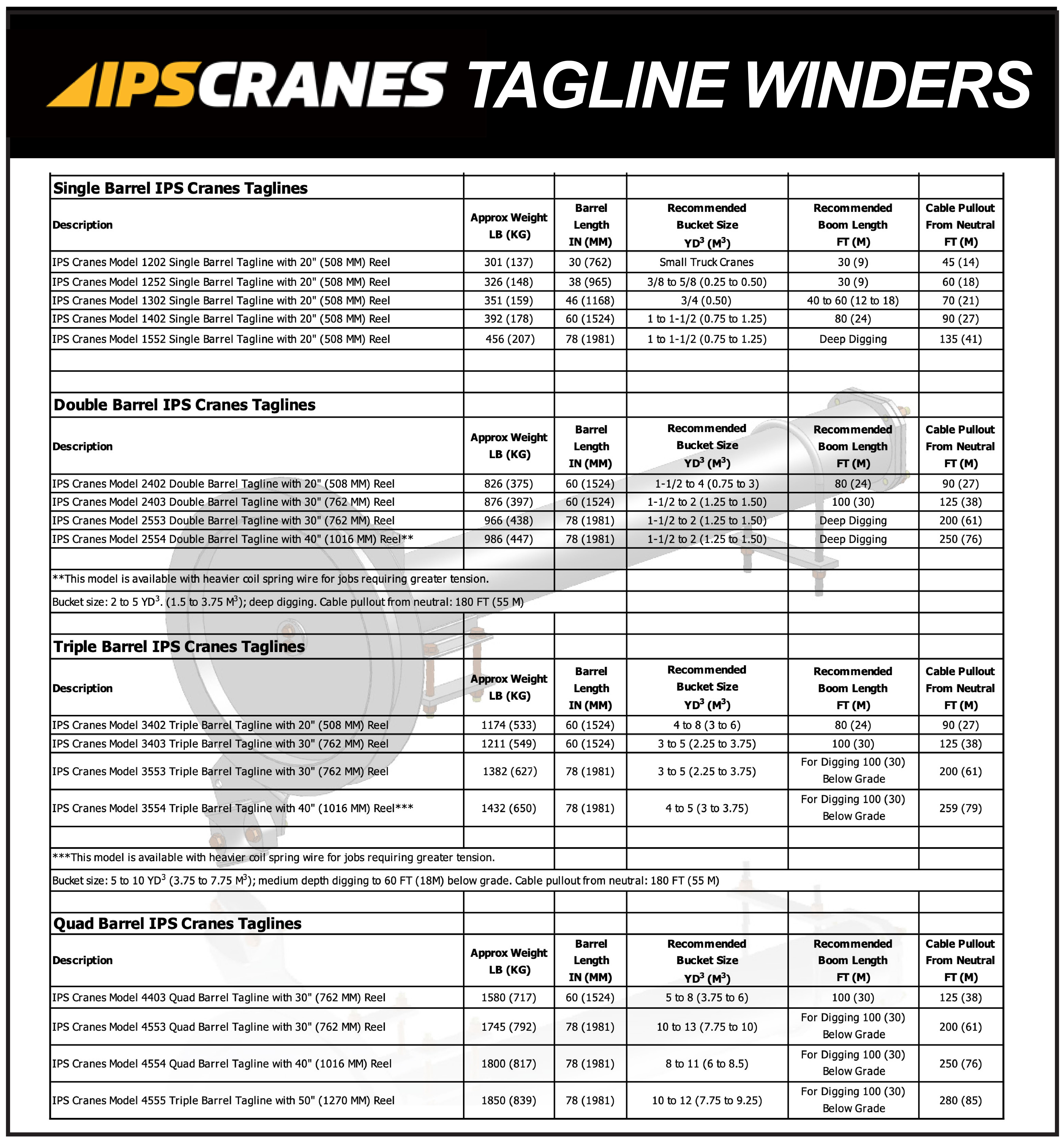 Manufactured by IPS Cranes, tagline winders and aftermarket parts for existing tagline winders are now available for order. Taglines operate automatically to provide constant and positive tension to stabilize clamshell buckets and other types of crane loads for various applications. Mounted onto a crane boom, the tagline holds the clamshell bucket steady while suspended in the air, regardless of the boom angle.